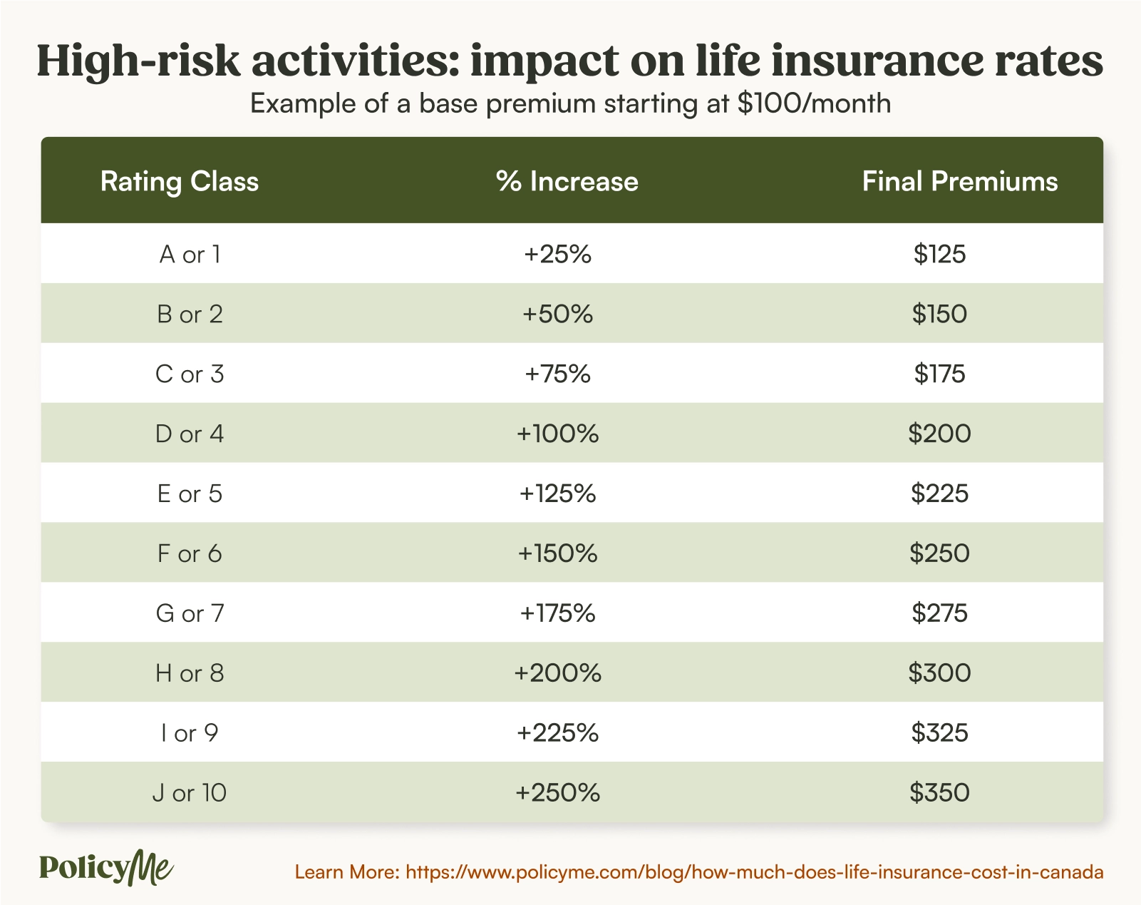 Here's where the math gets complicated. Your life insurance premiums are calculated with standard industry ratings, from A to J or 1 to 10, with 1 being the most ideal and 10 being the riskiest. If you engage in a few high-risk hobbies and your life insurance company places you in the "C" rating class, you could expect to pay about 75% more for life insurance.